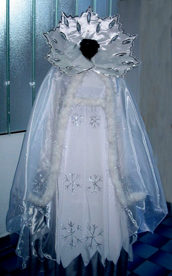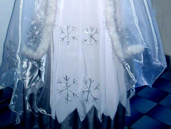 Snowflakes on the dress, sleeves and cape were made with hot glue. I