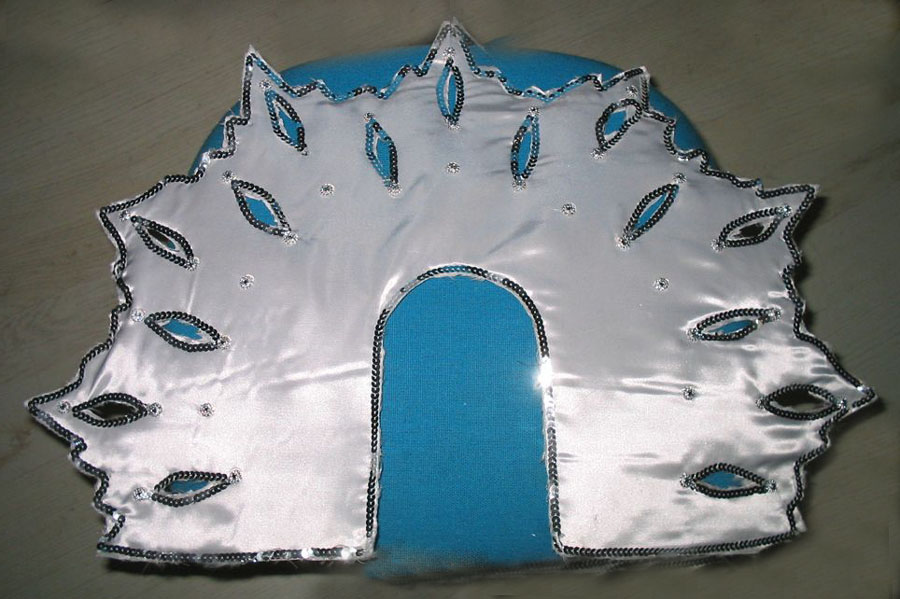 dressed the shape in white satin. Using hot glue gun, I decorated it with