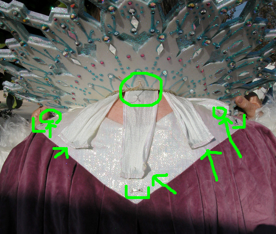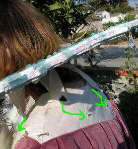 the neck. Arrows show where the fabric bits will be hooking. |